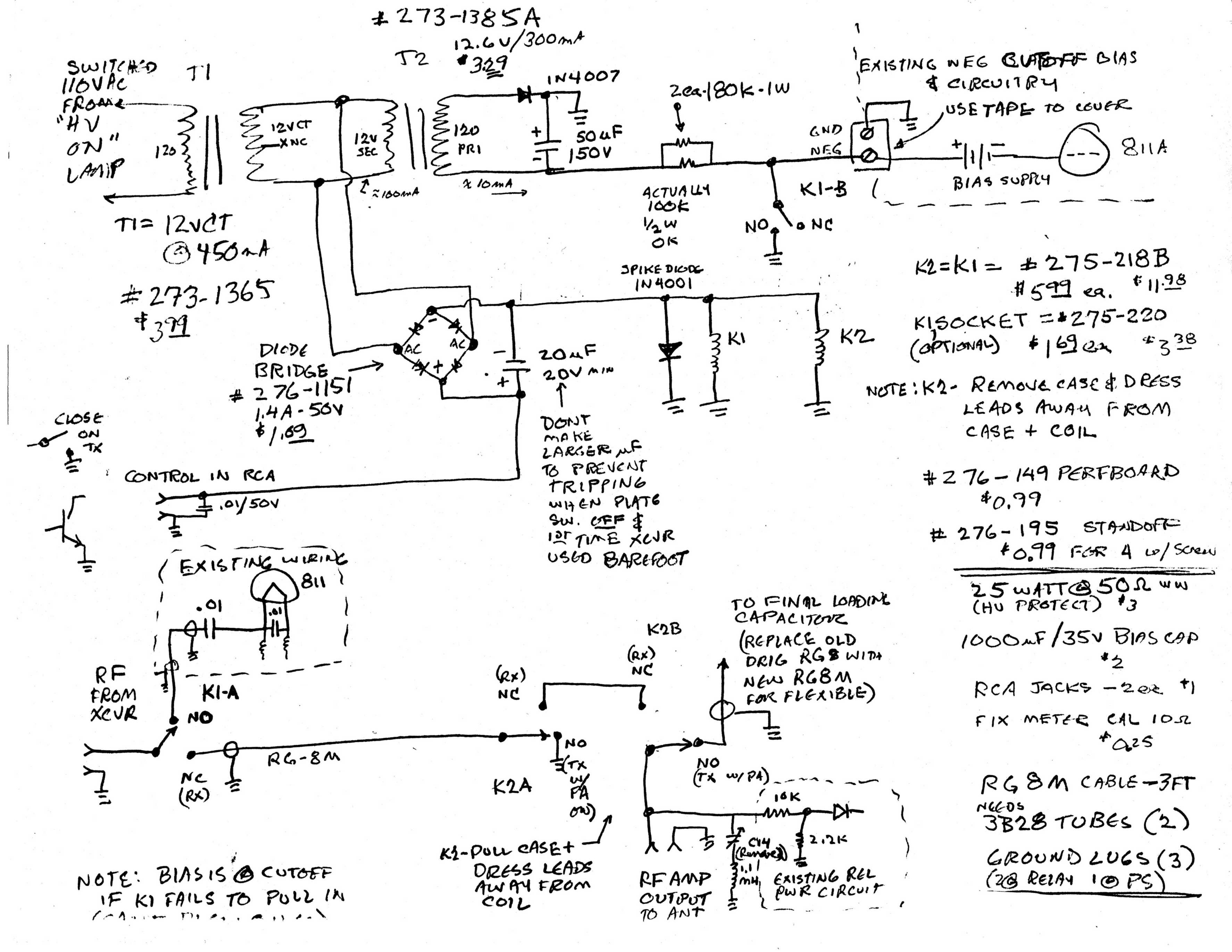 The primary of the first transformer wires directly across the primary of the HV transformer, so the relays cannot be activated without the plate supply being ON. Easiest place to get this is from the big bulb that indicates PLATE ON. This protects the grid circuit from ever having drive applied with the plates off (tubes destroyed instantly). The secondary 12 V is rectified and applied to the coils of both relays. Use a resistor to drop the half wave rectified voltage to 12 volts on the relays. The 12 volts is keyed via the back panel transmit/receive jack to the transceiver. Most transceivers want a positive voltage less than 12 vdc, so I put the +12v on the top of the coil and ground the lower side of the coils via the receiver contacts.
